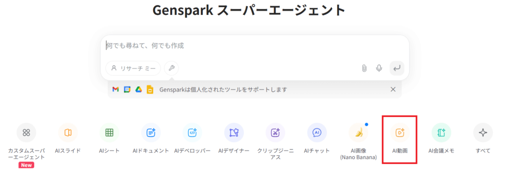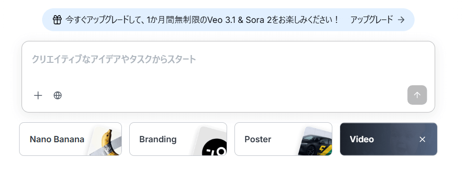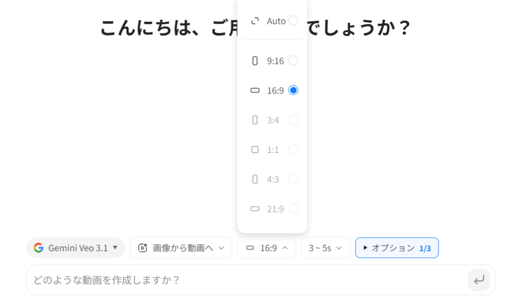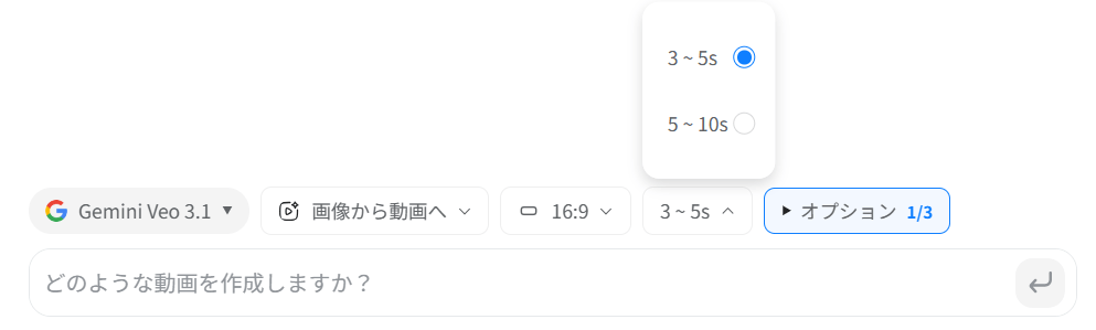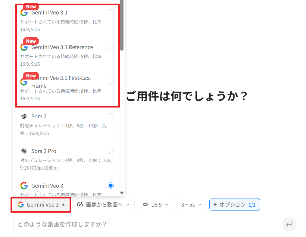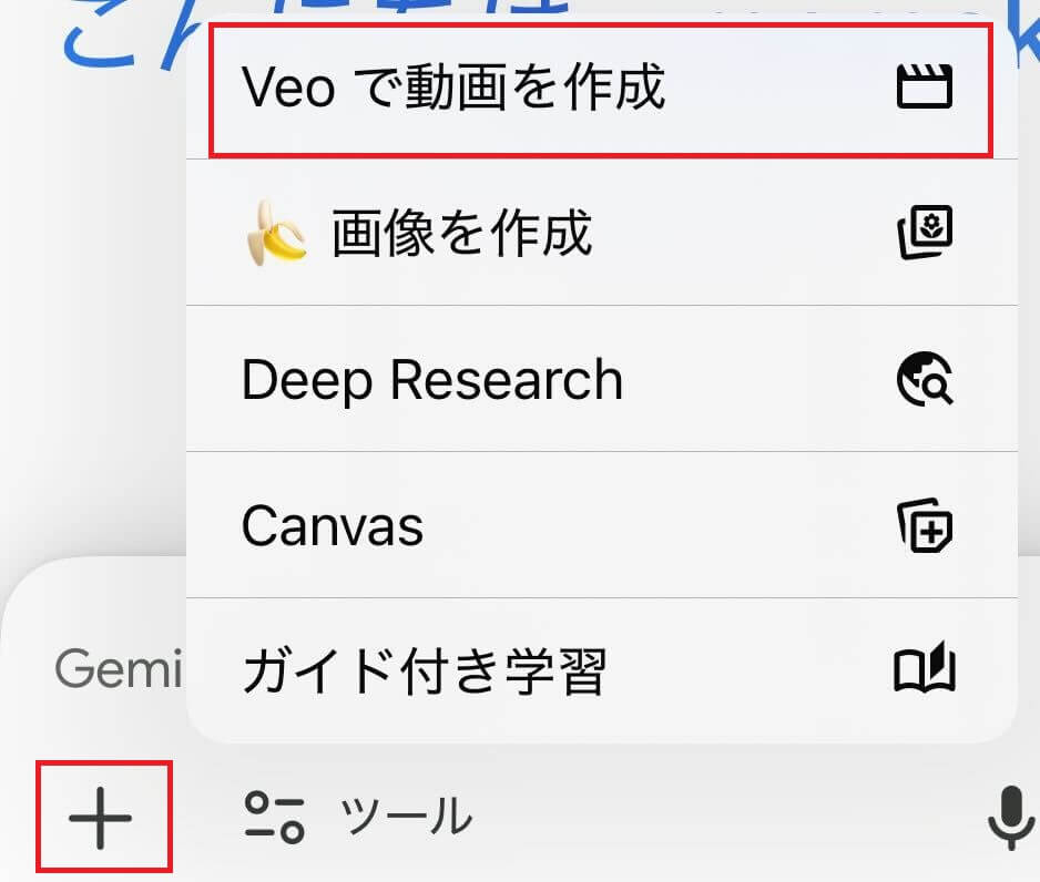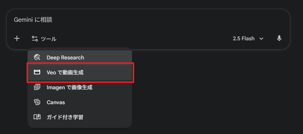 - ステップ3チャット画面下部の機能メニューから「Veoで動画生成」を選択