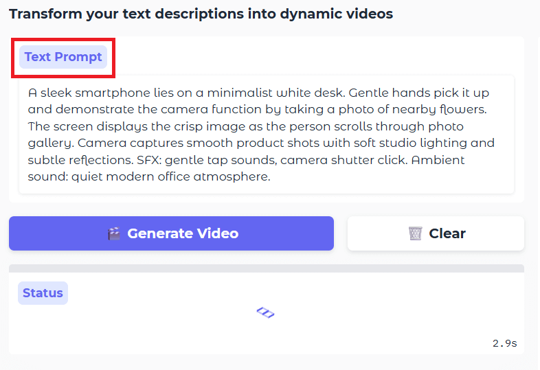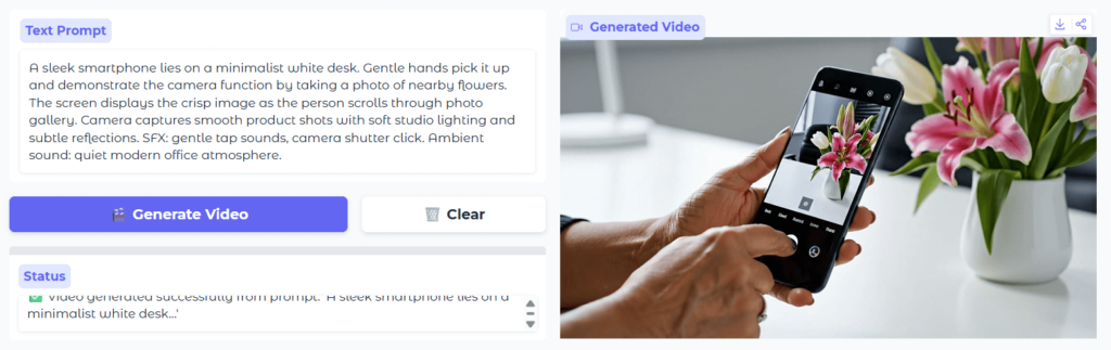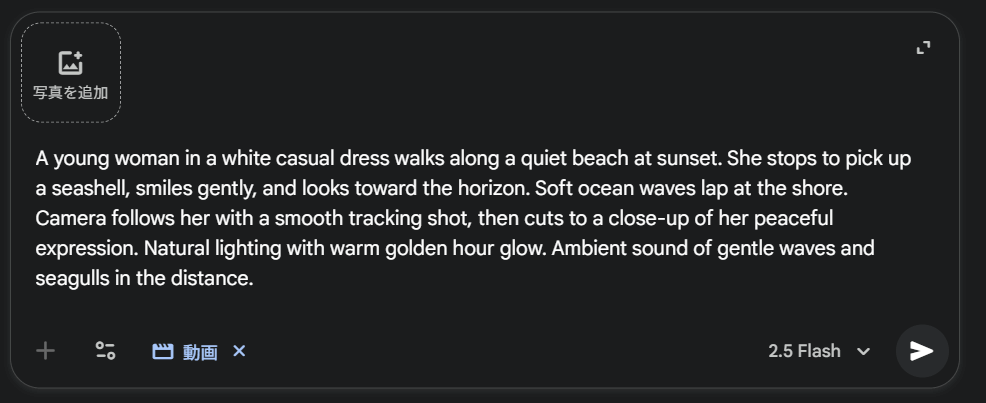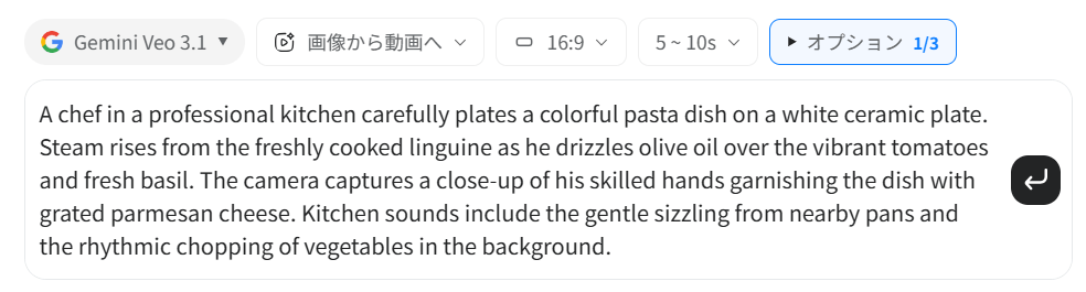 ①テキストから動画生成:シンプルなプロンプト入力だけで、8秒の高品質動画を生成できます。AIが自動でプロンプトを最適化してくれるので、細かい指示を書かなくても自然な映像が作れるのが魅力ですね。