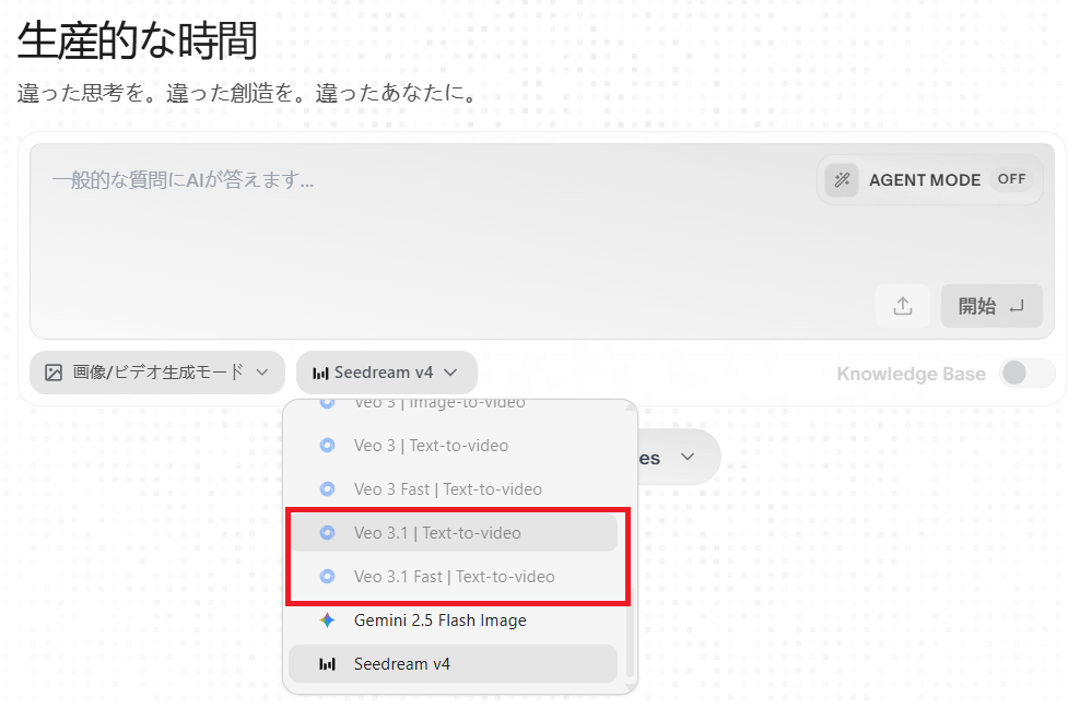 - ステップ2左下の機能セレクターから「Veoで動画生成」を選択