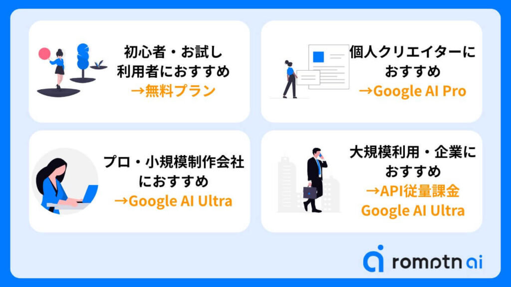 - 本格利用ならGoogle AI Pro(月額2,900円)から始めるのがおすすめ