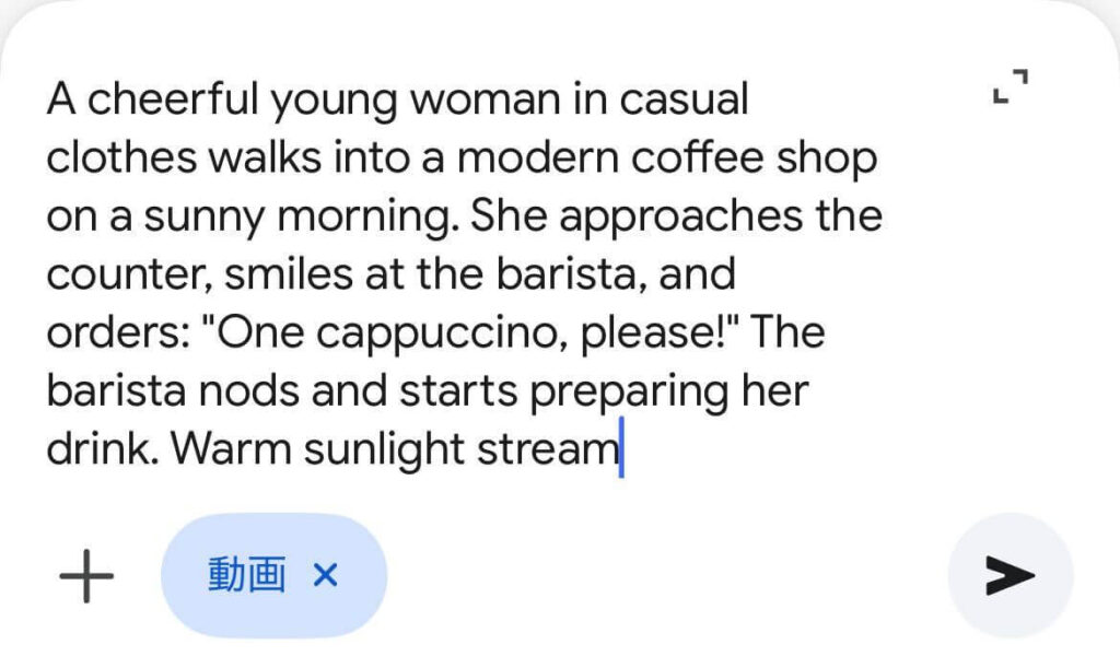 A cheerful young woman in casual clothes walks into a modern coffee shop on a sunny morning. She approaches the counter, smiles at the barista, and orders: "One cappuccino, please!" The barista nods and starts preparing her drink. Warm sunlight stream 訳:晴れた朝、カジュアルな服装の陽気な若い女性がモダンなコーヒーショップに足を踏み入れる。彼女はカウンターに近づき、バリスタに微笑みかけ、「カプチーノをお願いします!」と注文する。バリスタはうなずき、飲み物を作り始める。温かい日差しが差し込む。