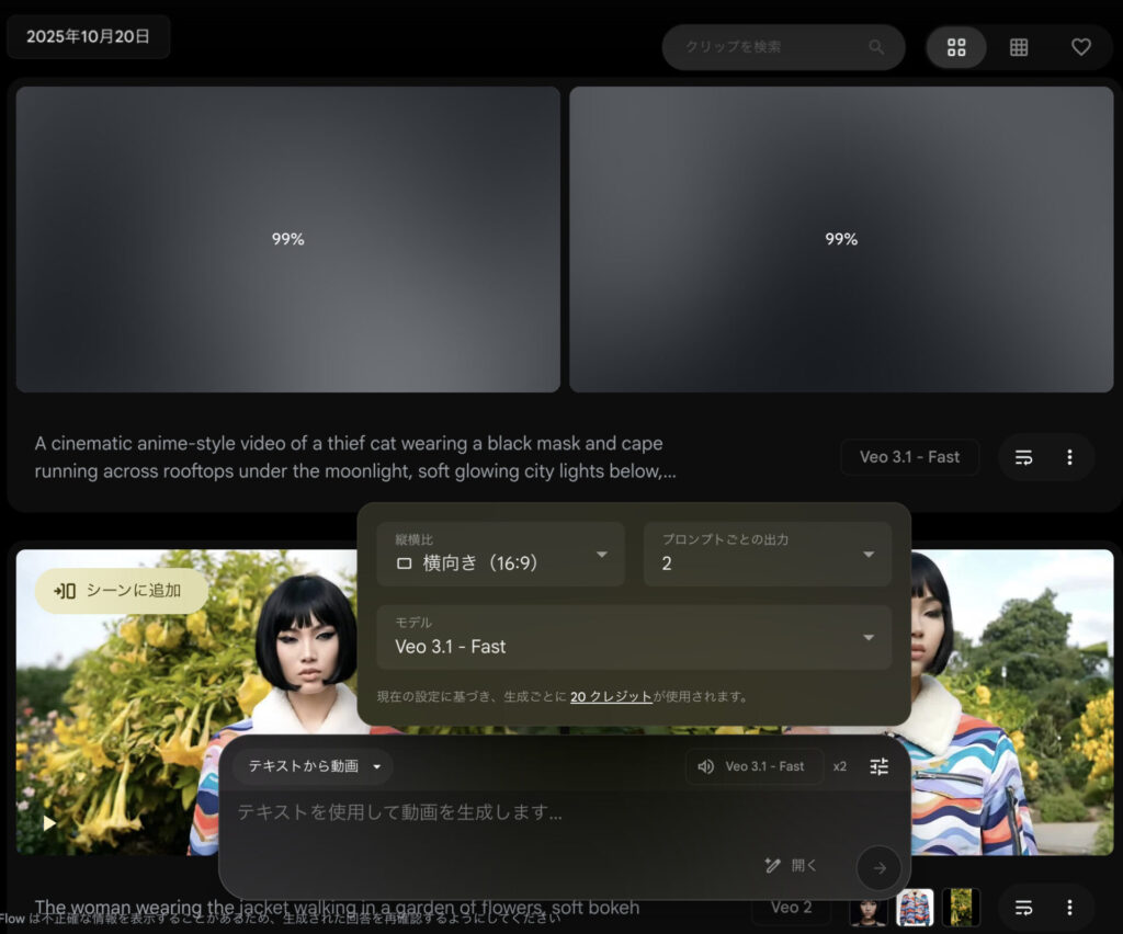 そのため、Flowを使って長尺動画を作る場合は、複数回の生成を前提に進める必要があります。