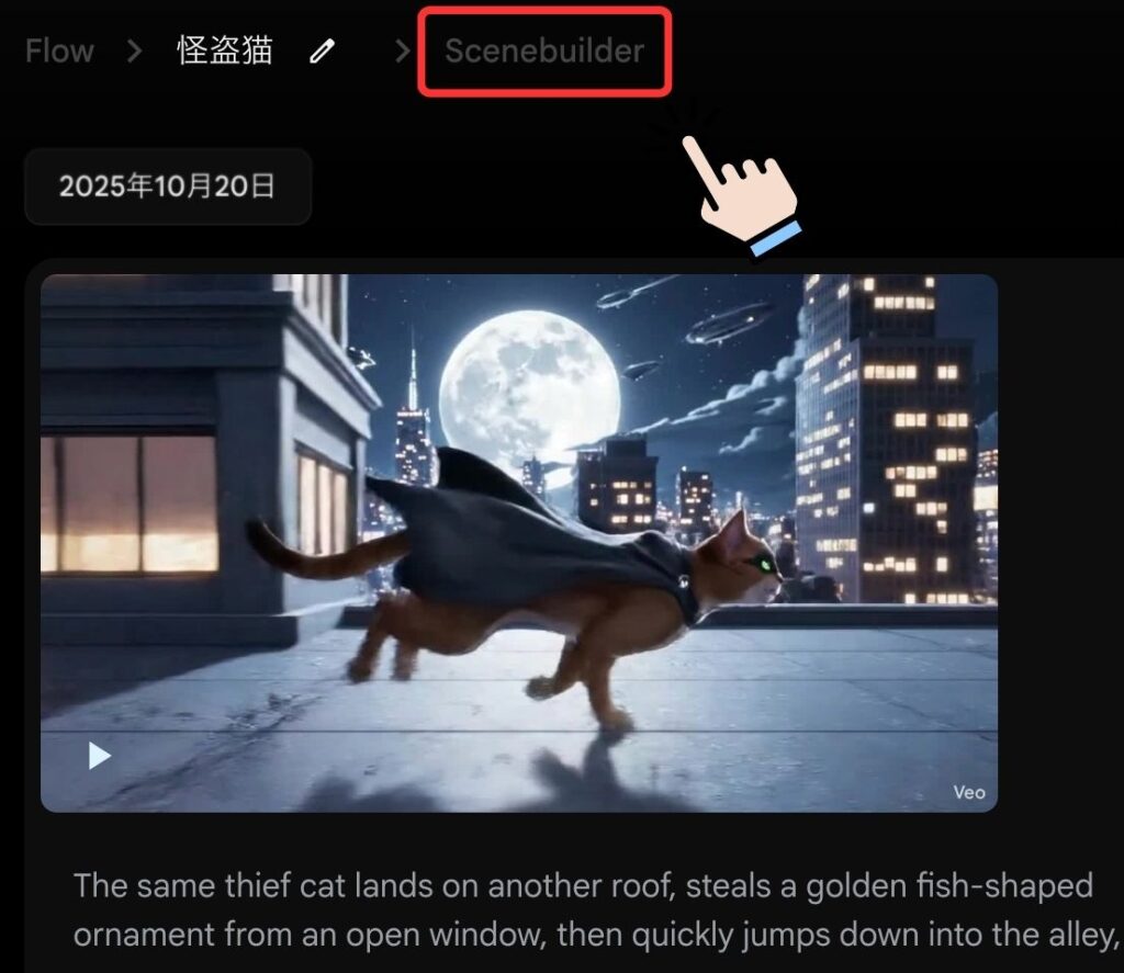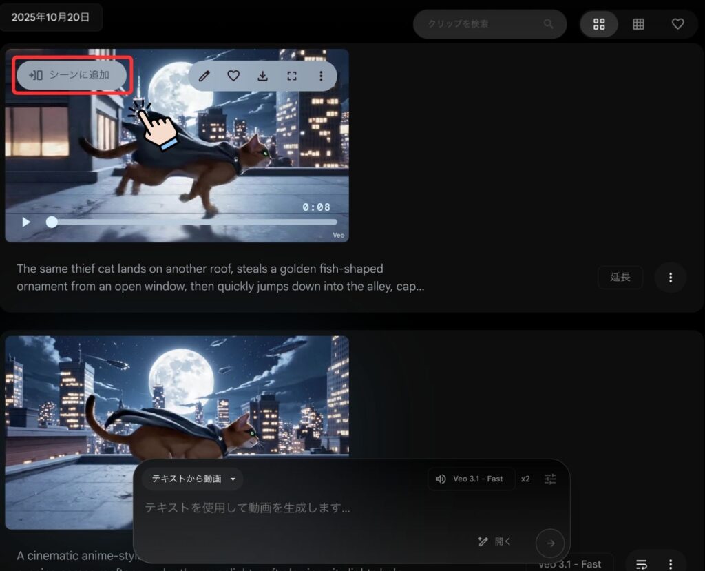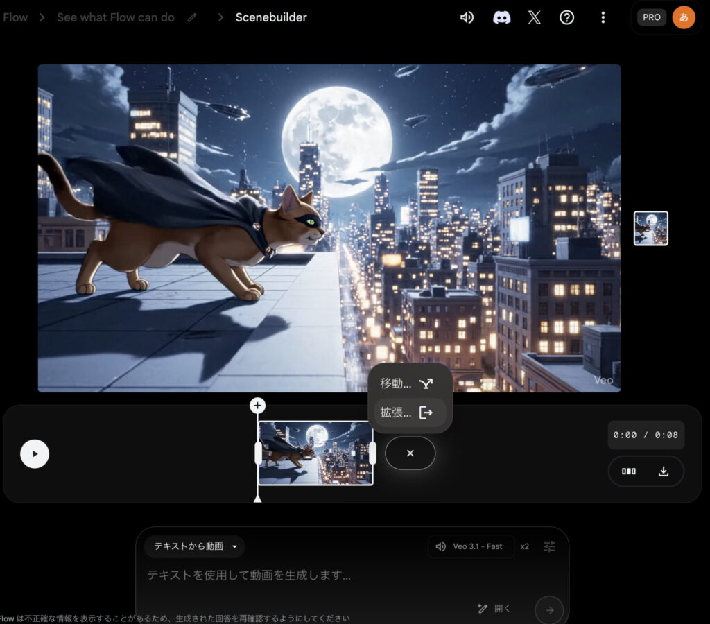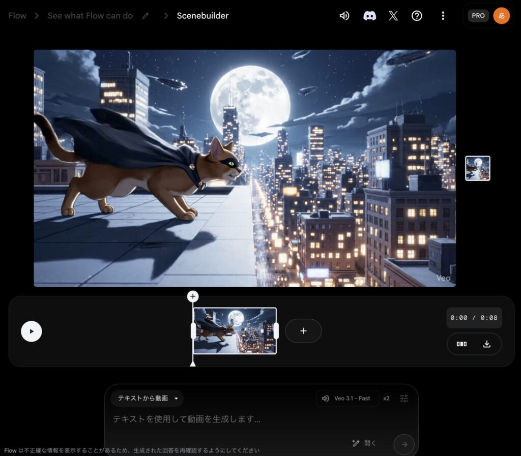 Veo 3.1では1回の生成で8秒までの動画が作成できますが、Flow機能を使うことで、シーンをつなげながらより長尺の映像を制作することも可能です。