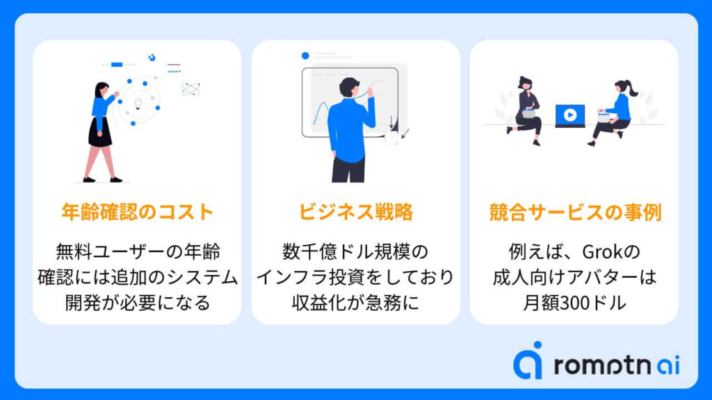 一つは、競合サービスとの競争激化です。イーロン・マスク氏のGrokはすでにエロティックなアバター「Ani」を導入しており、Character.AIやReplikaといったサービスも恋愛やエロチャットで人気を集めています。ChatGPTが市場シェアを維持するためには、ユーザーの多様なニーズに応える必要があったのです。