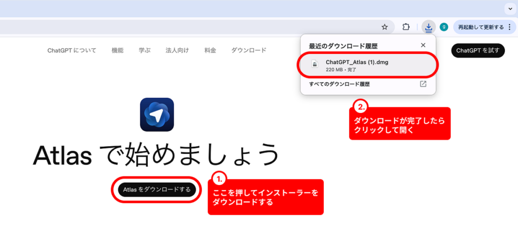 まず、OpenAIの公式サイトからAtlasのインストーラーをダウンロードします。
