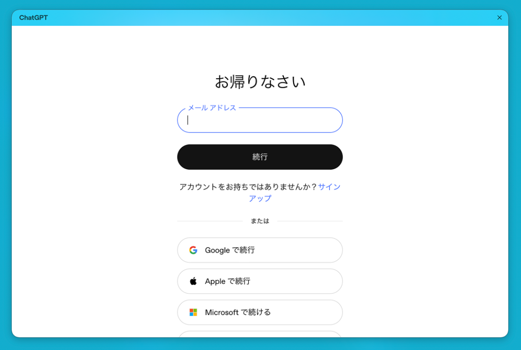 FinderからApplicationフォルダにAtlasがあるので、それを開くとまずChatGPTのアカウントでログインが要求されます。もしもまだアカウントがない場合はサインアップを選択してアカウントを作成する必要があります。