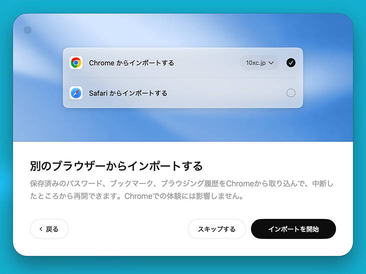 - データインポート機能: 初回起動時にChatGPTアカウントでサインイン後、現在のブラウザ(Chromeを含む)からブックマーク、保存パスワード、閲覧履歴を自動的にインポート可能。セットアップフロー内で直接実行され、数クリックで完了。