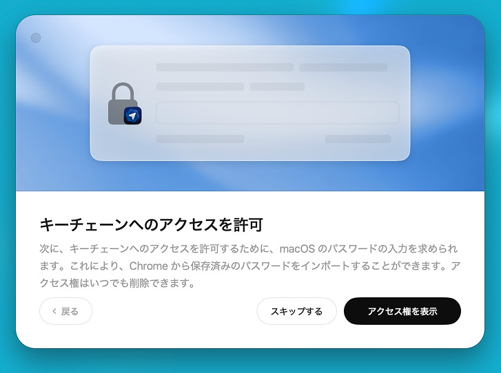 Chromeに登録されている各Webサービスなどのログイン情報へのアクセスを求められます。キーチェーンの移行をすることができますが、後ほど紹介するように米ユーザーを中心に安全性の懸念が警鐘されているため、心配な方はスキップしましょう。