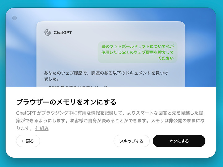 ブラウザ内での閲覧履歴などをChatGPTが記憶・学習する機能です。オンにすることでよりパーソナライズされたAI機能を使うことができますが、普段からChatGPTアプリでもメモリ機能をオフにしている方や、自分の閲覧行動を学習に使われるのに抵抗感がある方はスキップしましょう。