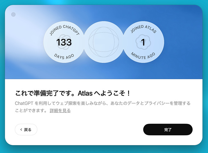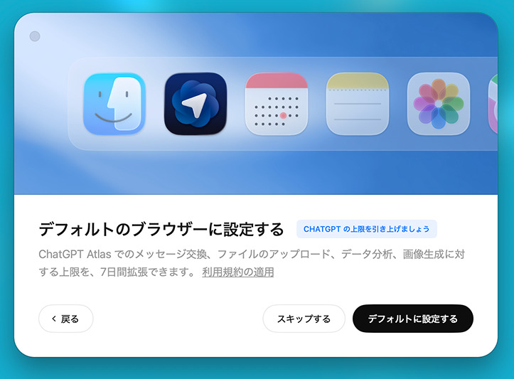 Atlasを今後デフォルトにしたい方は「デフォルトに設定する」を選択します。もちろん後から切替可能なので、まずはスキップしても大丈夫です。