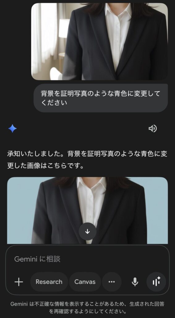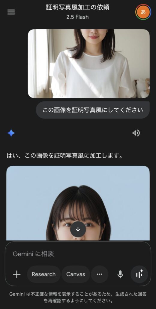 操作もシンプルで、Geminiにログインして自撮り写真をアップロードするだけで、数秒で“証明写真風”の自然な画像を作成できます。