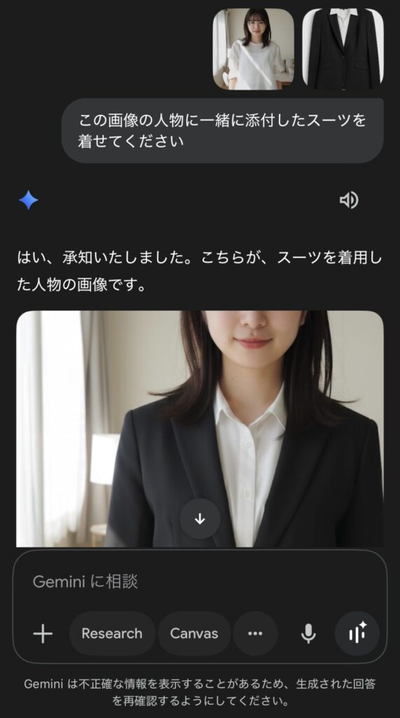 「プロンプト例:この画像の人物に一緒に添付したスーツを着せてください」