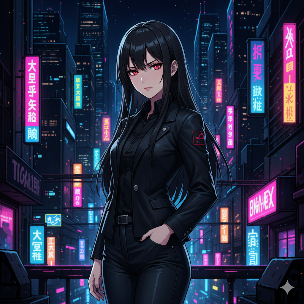 masterpiece, best quality, 1 girl, solo, cool beauty, sharp eyes, serious expression, long black hair, straight hair, red eyes, pale skin, black outfit, jacket, pants, urban background, night city, neon lights, standing, hand in pocket, looking at viewer, anime style, detailed eyes, high contrast, cinematic lighting
