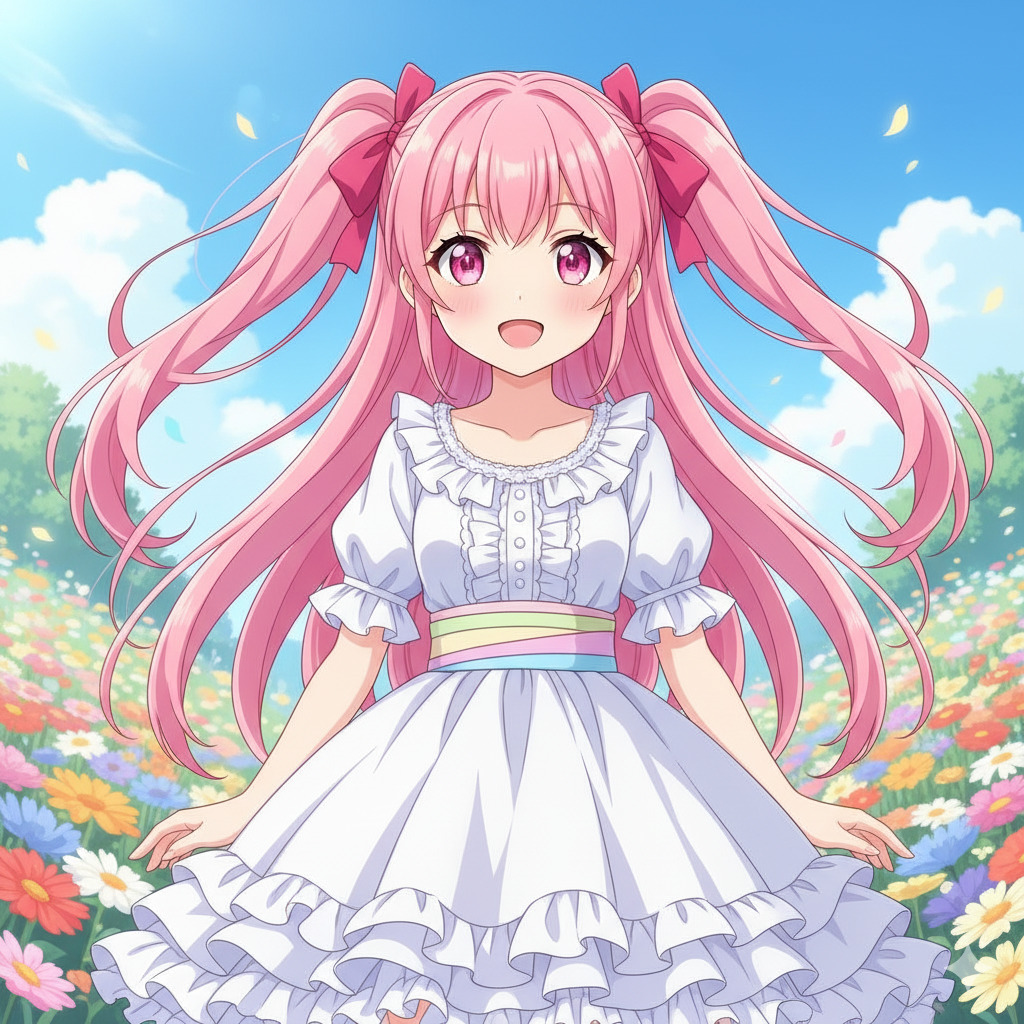 masterpiece, best quality, 1 girl, solo, cute anime girl, big sparkling eyes, small mouth, happy smile, pink hair, twin tails, hair ribbons, blush, white dress, frills, pastel colors, outdoor, flower garden, blue sky, sunlight, full body, standing, looking at viewer, anime style, cel shading, vibrant colors