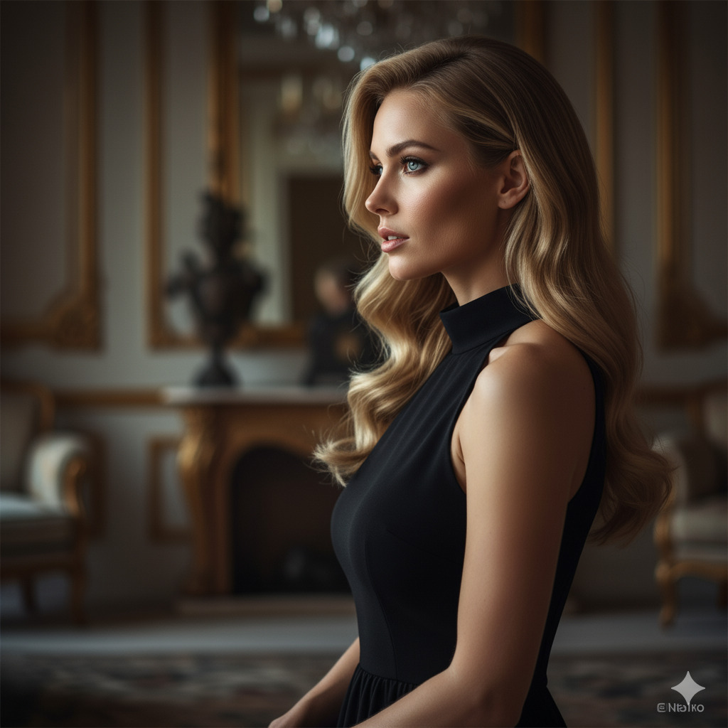 傑作、最高品質、美しいヨーロッパ人女性1人、ソロ、自信に満ちた表情、鋭い目、高い頬骨、くっきりとした顎のライン、ウェーブのかかったブロンドの髪、青い目、完璧な肌、ドラマチックな照明、屋内、高級インテリア、黒のイブニングドレス、優雅なポーズ、目をそらす、横顔、映画のような、ファッション写真、被写界深度、8K、ハイパーリアリスティック