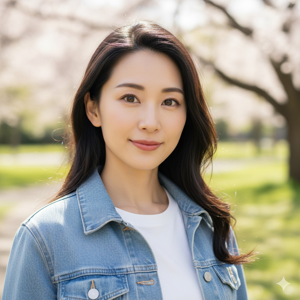 masterpiece, best quality, 1 beautiful Japanese girl, solo, natural makeup, soft smile, long black hair, gentle eyes, delicate features, porcelain skin, natural lighting, outdoor, park, spring day, casual fashion, denim jacket, white t-shirt, looking at viewer, upper body, bokeh background, photorealistic, 8k