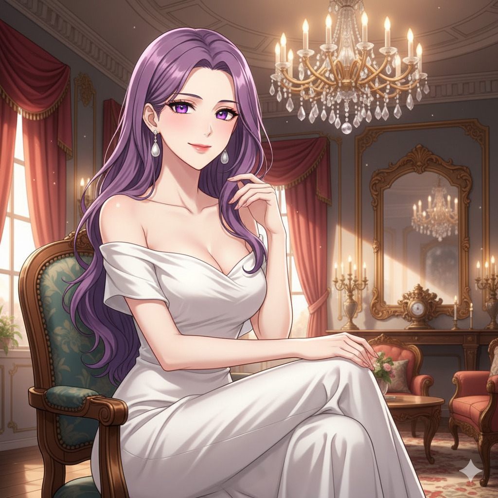 傑作、最高品質、女の子1人、ソロ、上品な女性、優しい笑顔、大人、長いウェーブヘア、紫色の髪、紫色の目、細かい目、洗練されたメイク、白いオフショルダードレス、真珠のイヤリング、屋内、上品な部屋、シャンデリア、椅子に座る、足を組む、優雅なポーズ、アニメ風、柔らかい照明、暖色系、詳細な背景