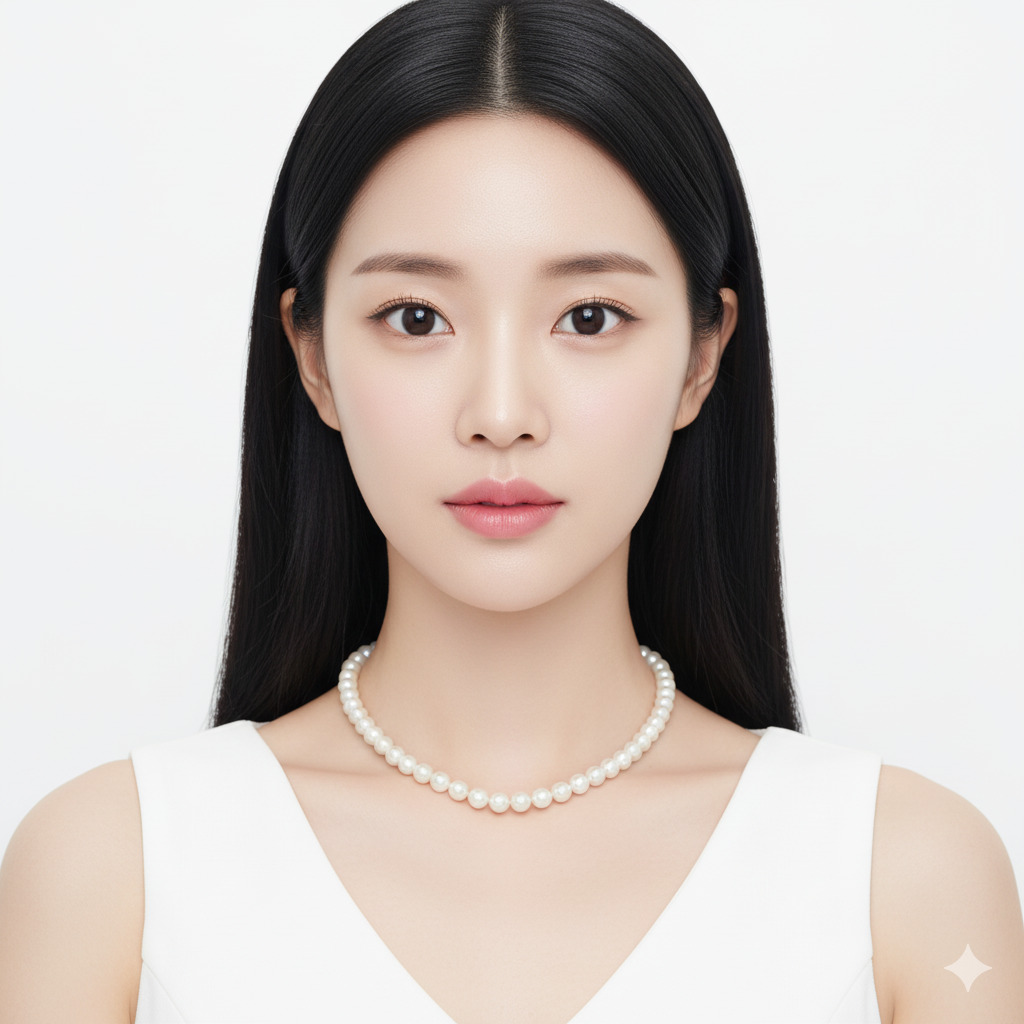 masterpiece, best quality, 1 beautiful Korean girl, solo, elegant, innocent face, big round eyes, small nose, pink lips, long straight hair, pale skin, glowing skin, studio lighting, white background, simple white dress, pearl necklace, looking at camera, face focus, professional photography, high resolution, 8k, ultra detailed