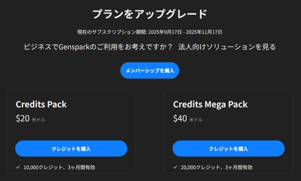 ただし、クレジットパックはPlusプランを契約している方のみ利用可能であり、無料プランやProプランの方は購入できない点に注意が必要です。