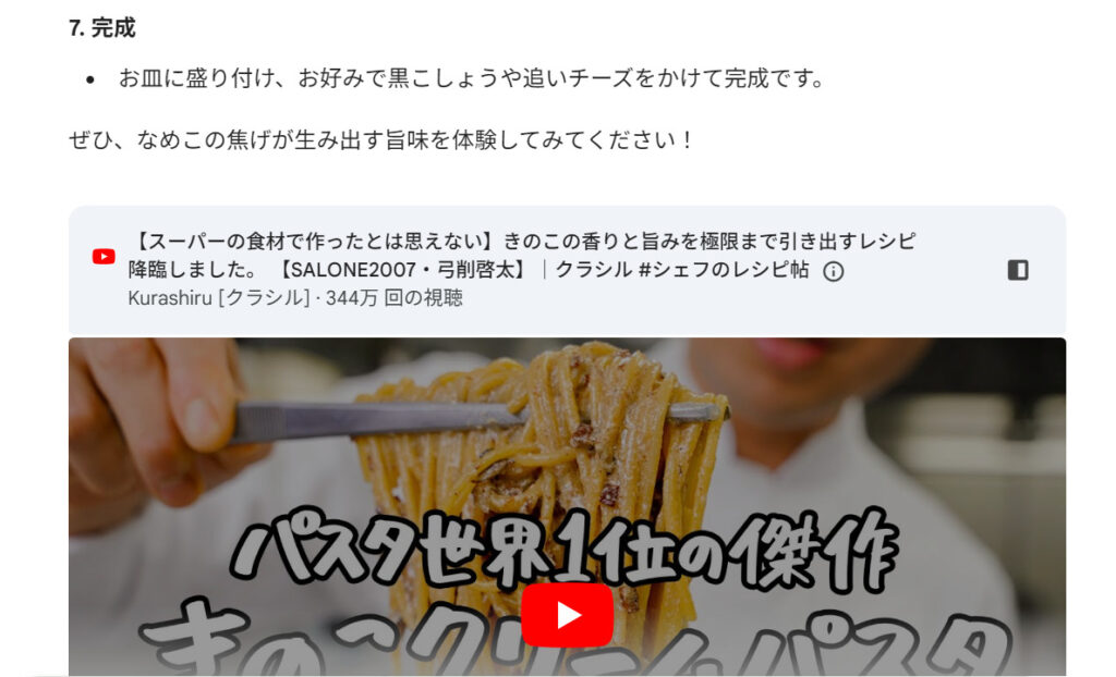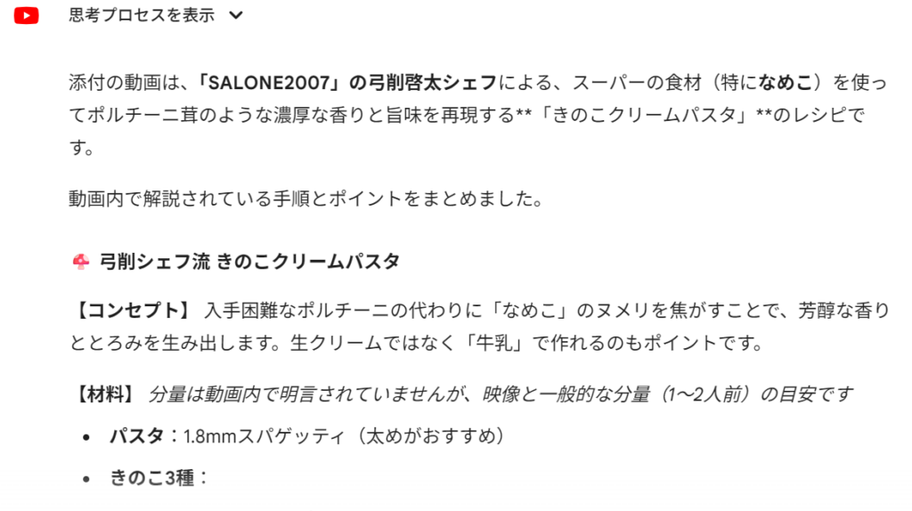 YouTubeの料理動画のURLを貼り付けて、「添付リンクの動画内容を理解してレシピを教えて」と頼んでみました。