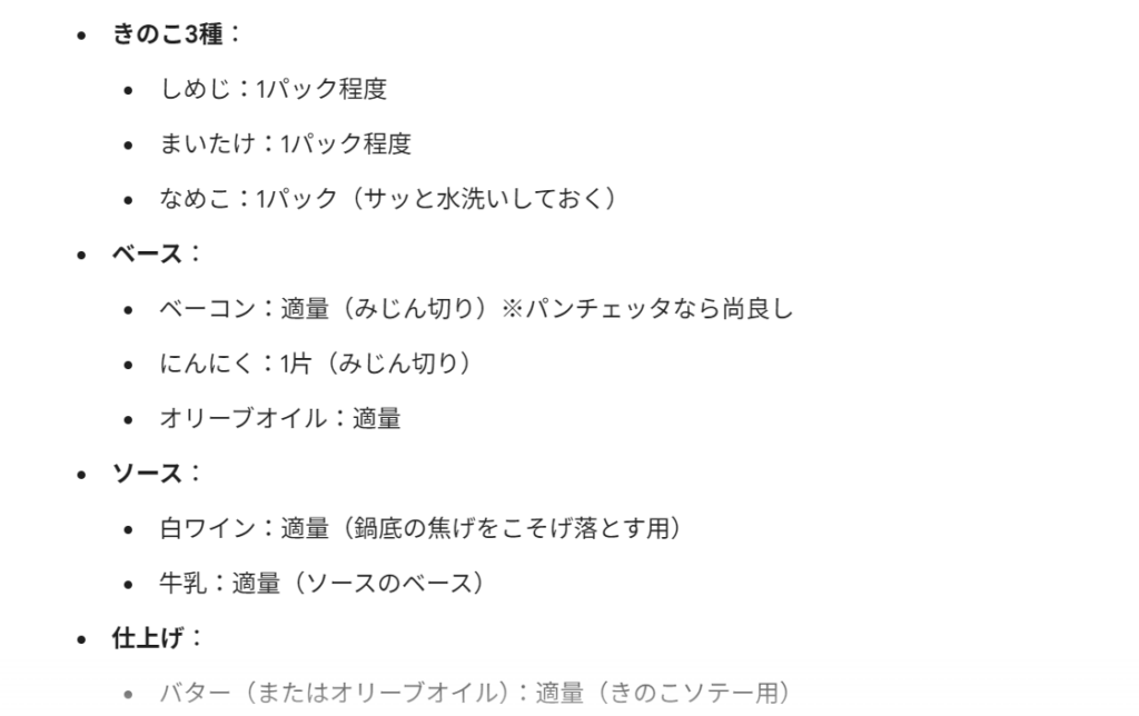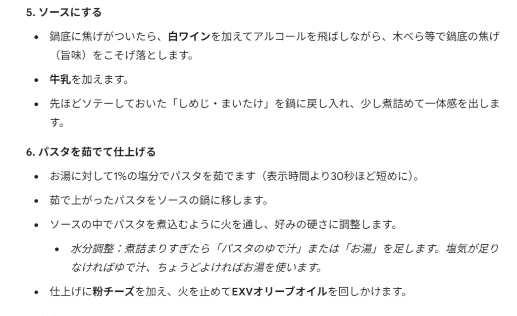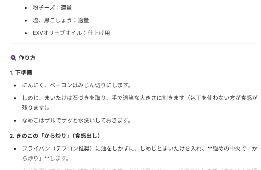 すると、動画内の音声だけでなく、映像内でのテロップ(調味料の分量など)もしっかり読み取って、完璧なレシピカードを作ってくれました。これは時短ツールとして非常に有益です!
