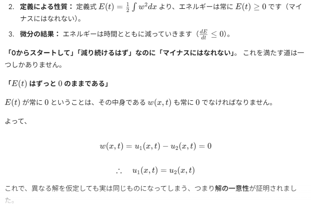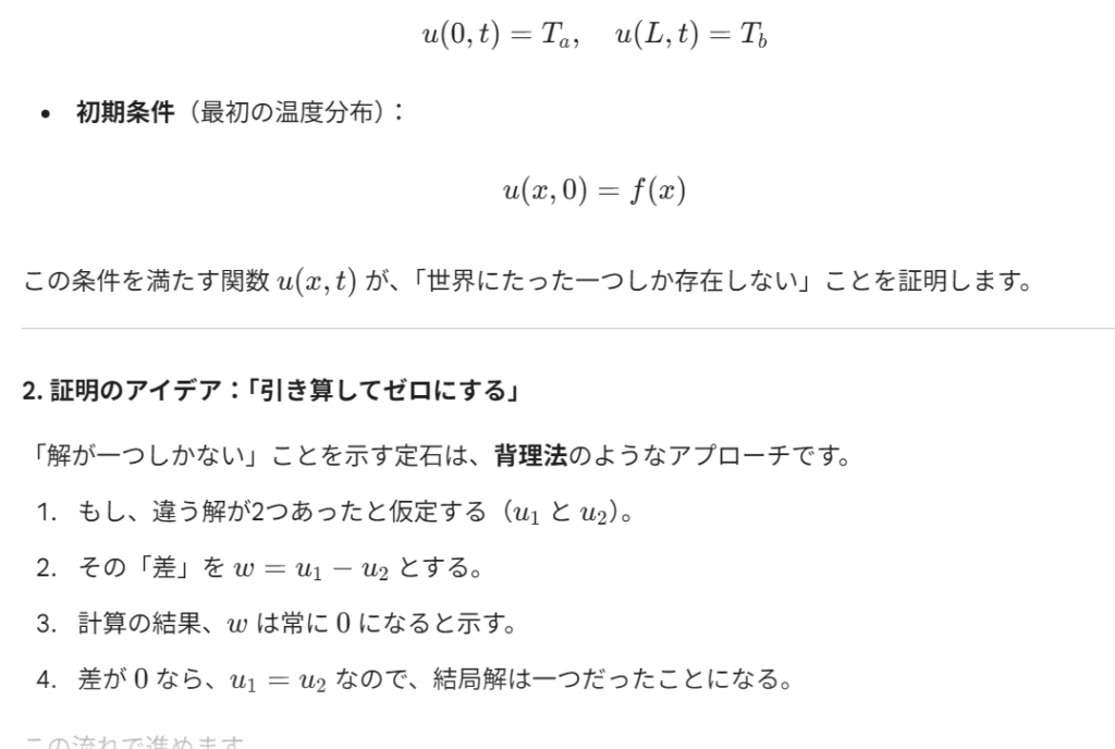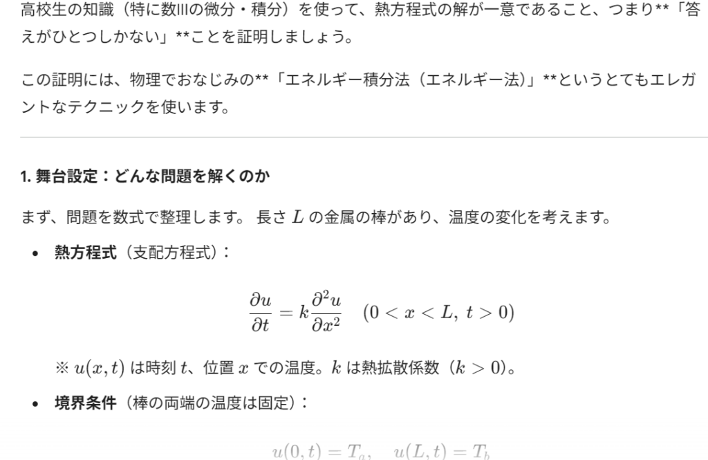 熱方程式の解の一意性を高校生でも分かるように証明して。ただし、初期条件、境界条件はあらかじめ決めてよいものとする。