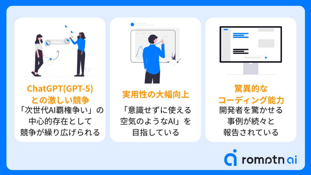 ①ChatGPT(GPT-5)との激しい競争:OpenAIのGPT-5リリース後、AI業界の競争は再び激化しています。Gemini 3.0 Proは、推論能力・コーディング性能・マルチモーダル統合において、GPT-5を上回り、「次世代AI覇権争い」の中心的存在となっています。
