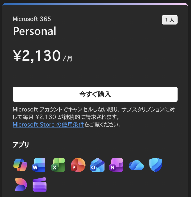 ・Microsoft 365 Personal :2,130円/月(21,300円/年)