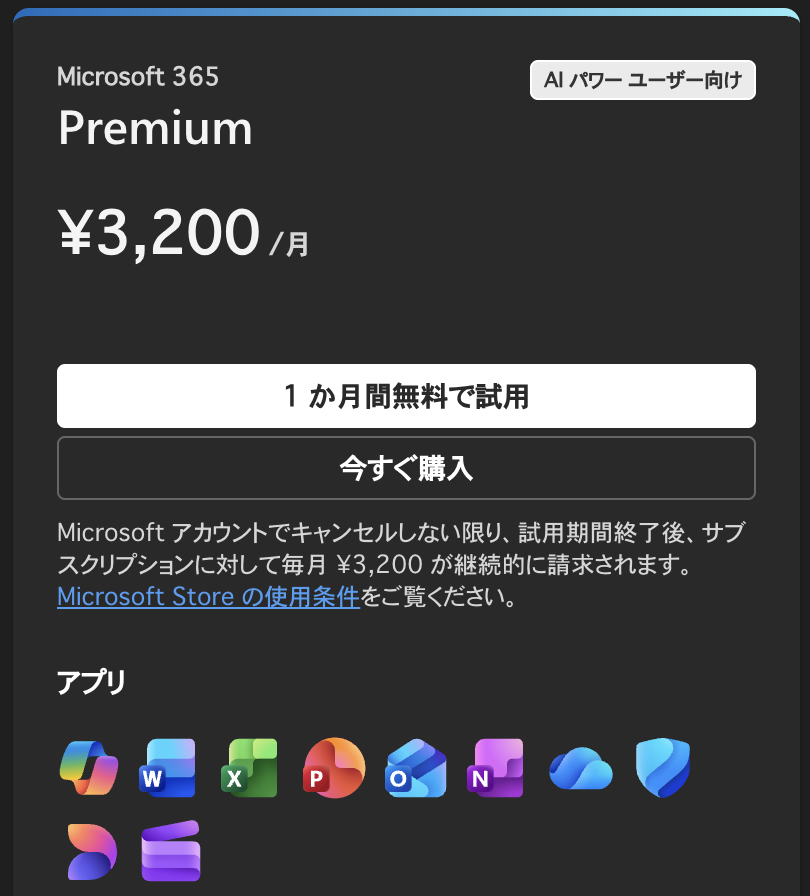 ・Microsoft 365 Premium :3,200円/月(32,000円/年)