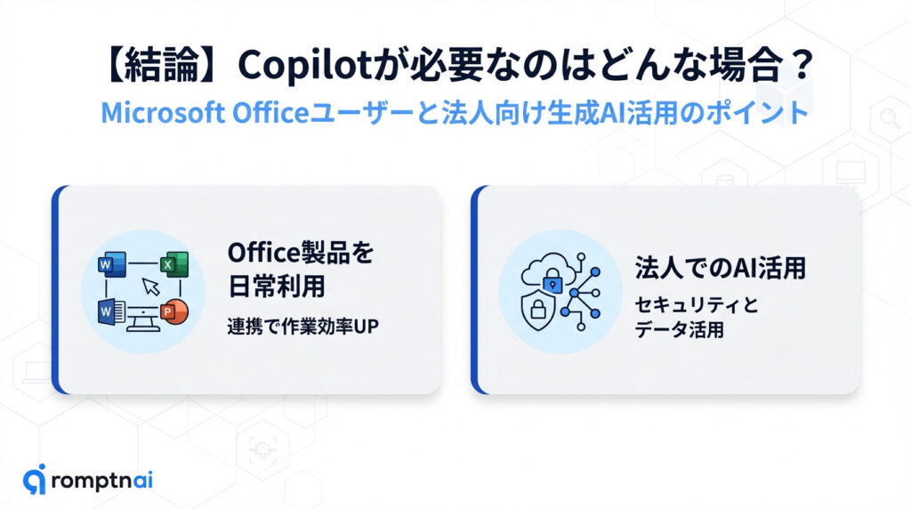 - 法人なら「生成AIを使った業務効率化をしたい」場合はCopilotが必要。