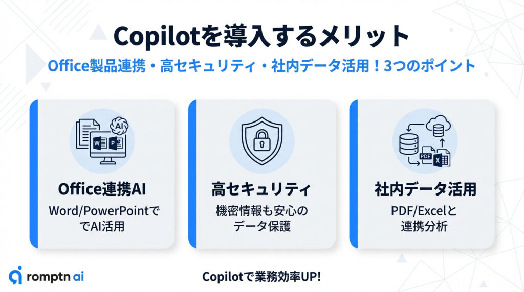 - Copilotを導入するメリットは「Office連携」や「強固なセキュリティ」がある。