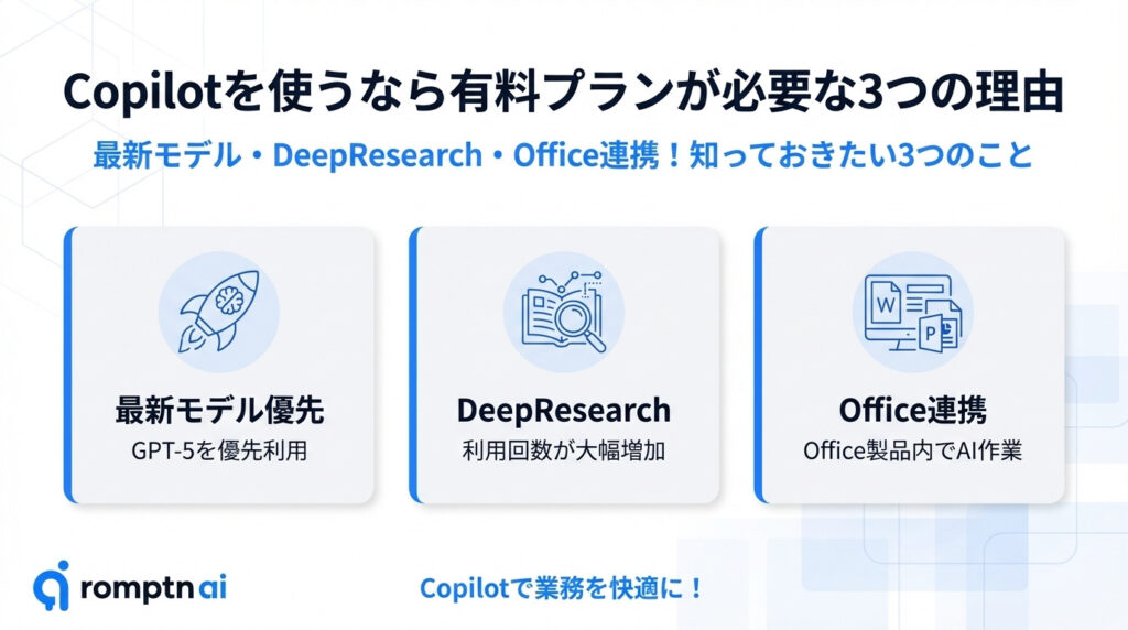 Copilotを使用する場合、可能であれば有料プランに契約することをおすすめします。理由は以下の3つです。