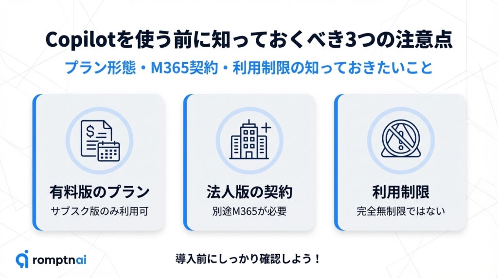 Copilotの法人プランである「Microsoft 365 Copilot」や「Microsoft Copilot Studio」を利用する場合はM365を別途契約する必要があります。