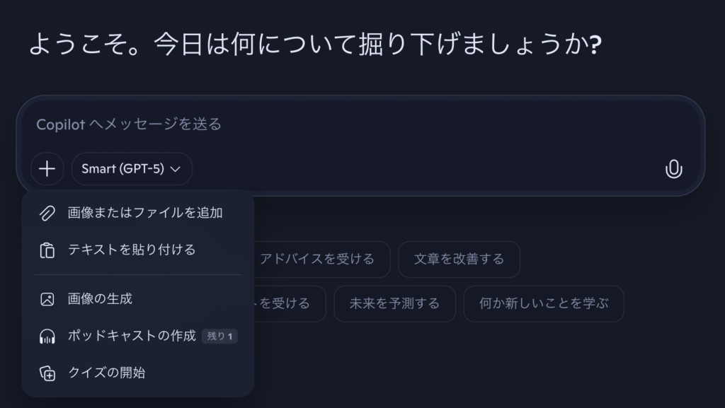無料版のCopilotはサインインをしない状態でも使用することが可能ですが、この場合、DeepResarchの使用は不可であり、ポッドキャストの作成も1回しかできません。実際にサインインせずに使用すると以下のような画面になっています。