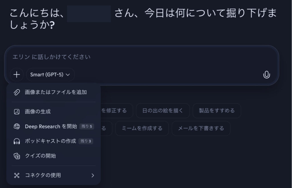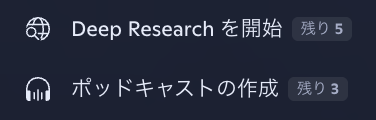 こちらではDeepResearchのタブが表示され、右側に「残り5」と、「ポッドキャストの作成」のタブの右側には「残り3」というように表示がされています。