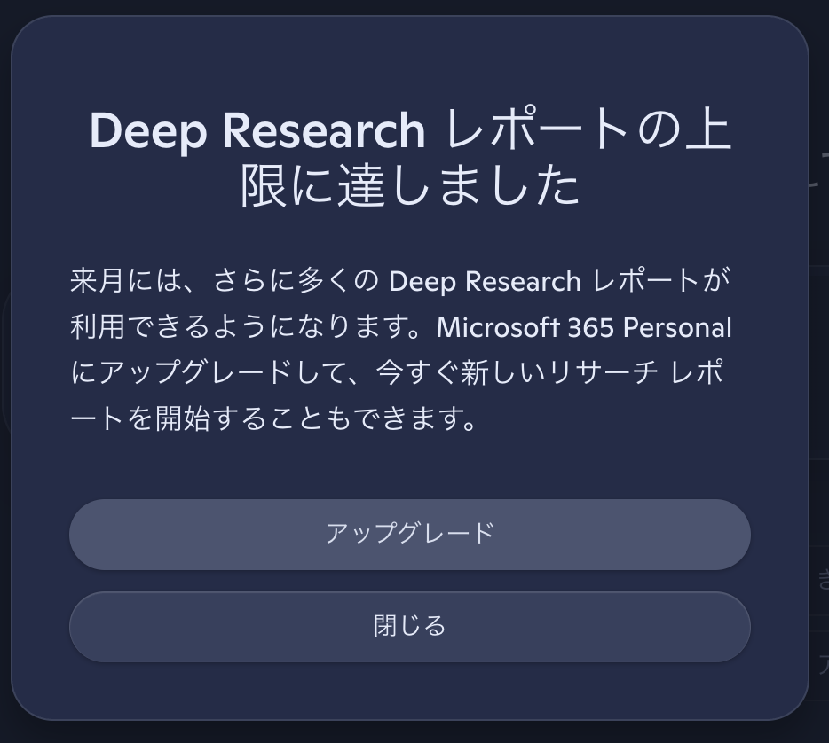 例えば、無料版のCopilotでDeepResearchの使用に制限がかかってしまった場合は、翌月になるまで待つことで再びDeepResearchの利用が可能になります。