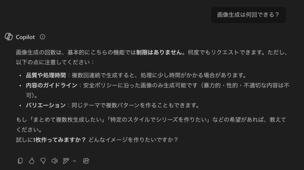 画像生成については公式では「サービス提供容量により変動します」とのみ記載されていますが、実際にCopilot Chat内で質問をすると以下の画像のように「制限は無い」との回答でした。