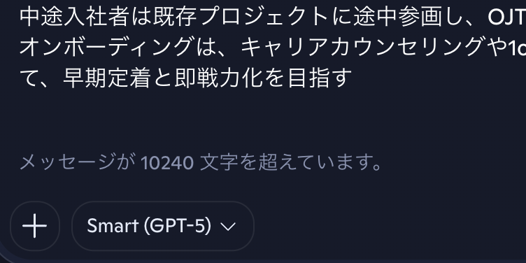例えば、プロンプトの文字数の上限は10,240文字と定められており、上の図のように制限を超えた文字数を入力すると質問ができなくなります。