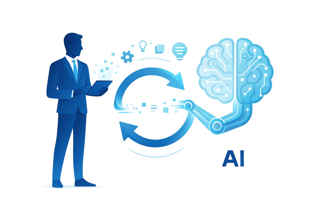 プロンプト: 「ビジネス資料向けの、人間とAIの相互連携を示す現代的なインフォグラフィック図。背景は純粋な白。 左側(人間): 青いスーツを着た、抽象的でスマートな人間のシルエットのアイコン。タブレット端末を持ち、そこから光るデータが発信されている。知的で能動的なポーズ。 右側(AI): 人間の脳の形を模した、複雑なデジタル回路と光るネットワークのアイコン。色は水色とシルバー。そこから伸びる半透明のデジタルアームが、左側に向かって伸びている。 中央(連携アクション): 人間とAIの間に、太く滑らかな双方向の矢印(ループ)が描かれている。矢印は青と水色のグラデーションで発光しており、その流れの中を小さなデータブロックやアイコン(歯車、電球、書類)が互いに行き交っている。 全体のスタイル: クリーンで洗練されたフラットデザインと、わずかな3D効果(アイソメトリック風)を組み合わせた、未来的で信頼感のあるスタイル。影や装飾は控えめに。」
