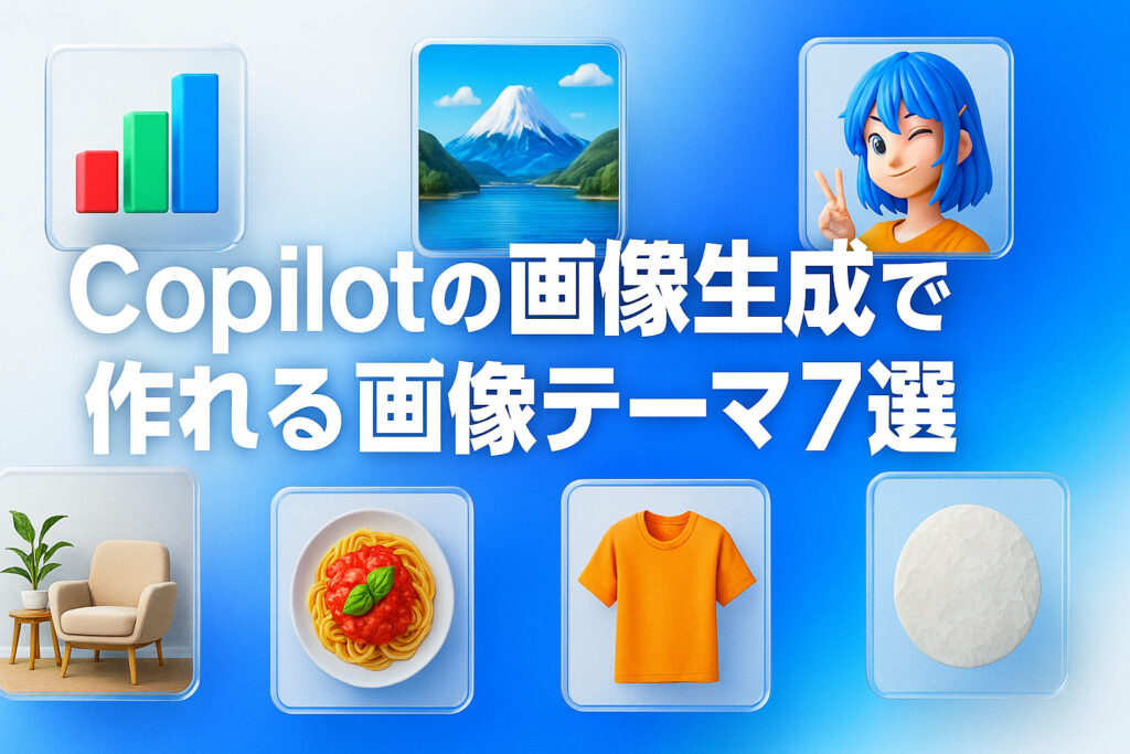 YouTube動画のサムネイル画像。アスペクト比16:9。 【テキスト】 画像の中央に、太く読みやすい日本語のゴシック体で「Copilotの画像生成で\n作れる画像テーマ7選」と大きく表示する。(※改行してバランス良く配置) 【配色】 背景は清潔な白と、鮮やかな「Copilotブルー(明るい青)」のグラデーション。爽やかでテック感のある配色。 【ビジュアル要素】 タイトル文字の周囲または下部に、今回紹介する7つのテーマを象徴する小さなアイコンや写真風のカードが並んでいる。 ビジネスグラフ 絶景の風景 アニメキャラクター 商品モックアップ おしゃれな部屋 料理 テクスチャ これらが3Dガラスのような質感のフレームに入って浮いている。 【画風】 立体的で高解像度な3Dレンダリングスタイル。影(ドロップシャドウ)を使って文字と要素を背景から浮き上がらせ、視認性を高める。