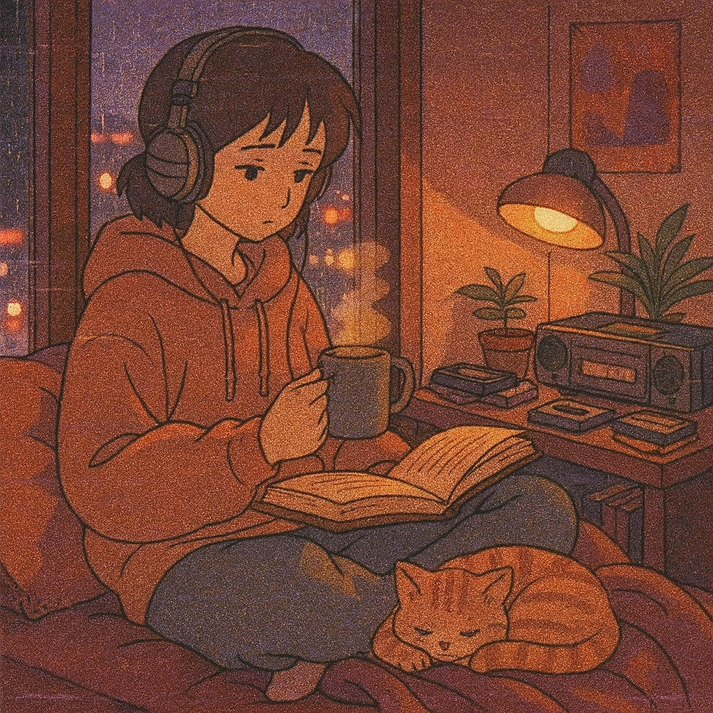 詳細プロンプト:Lo-Fiヒップホップ風イラスト アスペクト比: 正方形 (1:1) ※SNSアイコン等に使いやすい比率 【全体のスタイルと質感】 90年代のセル画アニメーションのような、温かく懐かしいLo-Fiヒップホップのアルバムアートスタイル。画面全体にVHSテープのようなノイズ、走査線、わずかな色ずれ(クロマティックアベレーション)があり、少しざらついた質感。色彩は彩度を落としたセピア調で、くすんだオレンジ、紫、青のグラデーションが基調。 【キャラクター】 窓辺の大きなクッションに深く座り、リラックスした様子の若い女性。オーバーサイズの古いパーカーとスウェットパンツを着用。頭には大きなレトロなヘッドホンをしており、膝の上で分厚い本を開いて読んでいる。手元には湯気が立つ陶器のマグカップがある。表情は穏やかで、少し眠そう。 【部屋の内部】 居心地の良い、少し雑多な部屋。机の上には古いカセットプレイヤーと散らばったカセットテープ、小さな観葉植物、温かい光を放つデスクライトがある。壁には色あせたポスターが貼られている。 【窓と外部の景色】 大きな窓ガラスには雨粒が絶えず当たり、結露で少し曇っている。窓の外は雨が降る夕暮れの街並みで、濡れたアスファルトやビルの窓灯り、車のテールランプがぼんやりとネオンサインのように滲んで光っている。 【サブキャラクター】 女性の足元の毛布の上で、茶トラの猫が丸くなって幸せそうに熟睡している。