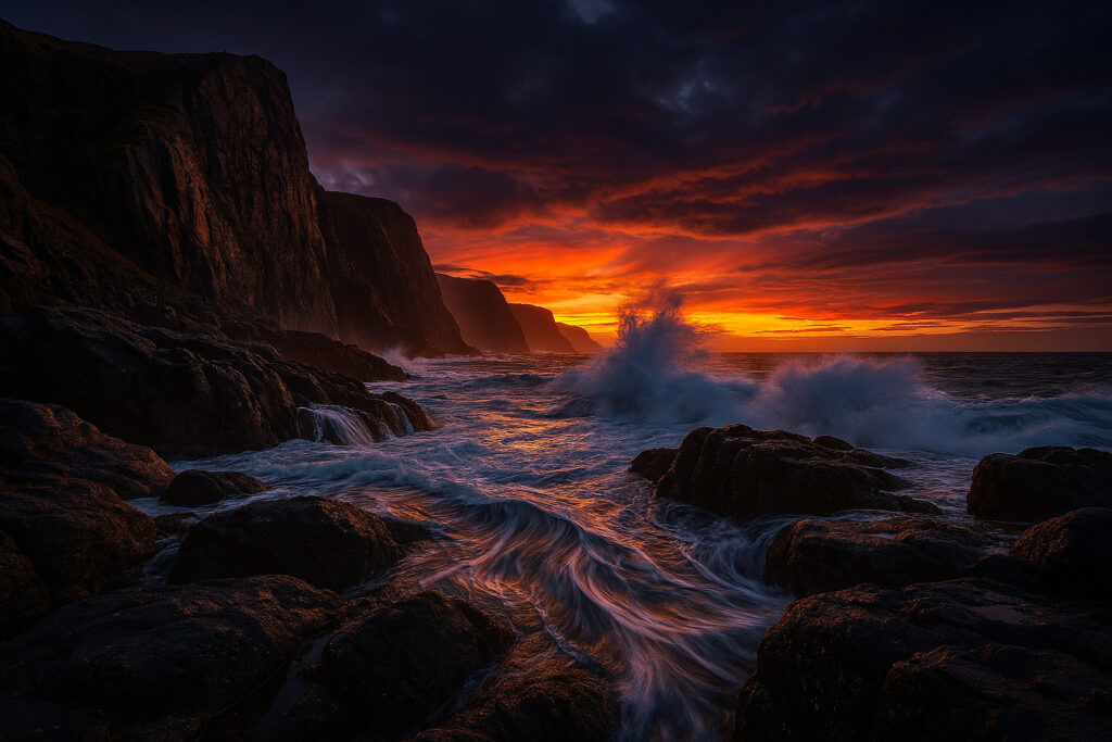 詳細プロンプト:夕暮れの荒々しい海岸線 アスペクト比: 写真らしい横長 (3:2 または 16:9) 【全体の構図とシチュエーション】 ナショナルジオグラフィック誌に掲載されるような、荒々しくも美しい自然の海岸線を捉えた超写実的な風景写真。場所は、切り立った断崖絶壁が海に迫る、岩だらけの海岸。時間帯は日没直後のマジックアワーからブルーアワーに移り変わる瞬間。 【海と波の表現(リアリティの核)】 海は荒れており、力強い波が次々と岸に押し寄せている。 重要なのは波の質感。シャッタースピードを少し遅くした撮影(スローシャッター)のように、波が岩に砕けて引いていく白い泡の軌跡が、絹糸のように滑らかで躍動感のあるラインを描いている。同時に、岩に衝突した瞬間の激しい水しぶきや霧は空中に静止しており、その一粒一粒が夕暮れの光を受けて輝いている。 【岩と前景の質感】 前景には、ゴツゴツとした巨大な岩盤が広がっている。波を被って濡れた岩肌は黒く光り、空の色や残照を鏡のように反射している。岩の割れ目には海水が溜まり、小さなタイドプール(潮溜まり)ができている。岩にはフジツボや濡れた海藻が付着しており、磯の香りが漂ってきそうなリアルな質感。 【空と光のドラマ】 空は劇的なグラデーション。地平線付近は燃えるような深いオレンジと赤で、上空に向かって徐々に深い藍色、そして夜の闇へと溶け込んでいく。嵐の余韻を感じさせる重たくちぎれた雲が低く垂れ込め、その隙間から強烈な夕陽の残光が差し込み、海面や濡れた岩を部分的に照らし出している。 【撮影スタイルと雰囲気】 超高解像度のデジタル一眼レフカメラで撮影された、RAW現像写真のような深い色味とコントラスト。湿った空気感、塩を含んだ海風、波の轟音が聞こえてくるような、圧倒的な没入感と荘厳な雰囲気。