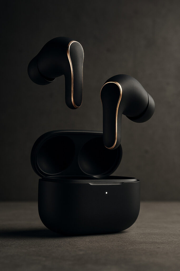 詳細プロンプト:ハイエンド・イヤホンの広告写真 アスペクト比: 広告らしい縦長 (2:3) または正方形 (1:1) 【全体のスタイルと品質目標】 世界的なテックブランドの広告に使用されるレベルの、超写実的なハイエンド・プロダクト写真。3DCG(Octane Renderなど)と実写の区別がつかないほどの最高品質。 【被写体(イヤホン本体)の詳細】 左右のイヤホンが空中にエレガントに浮遊している(広告的な演出)。 形状: 究極にミニマルで、人間工学に基づいた有機的な流線型。継ぎ目のないユニボディデザイン。 メイン素材: 非常にマットで、指紋がつかない特殊加工が施された深い黒のセラミック。光を吸い込むような重厚な質感。 アクセント素材: エッジ部分(面取り)やタッチセンサー部分に、ブラシ加工(サテン仕上げ)されたローズゴールドの金属が使われている。この金属部分が鋭く光を反射して輝きを放っている。 【被写体(充電ケース)の詳細】 イヤホンの真下に配置された充電ケース。蓋が少し開いており、内部の充電インジケーターが微かに上品な白LEDで光っている。素材感はイヤホンと同じ。 【ライティング(最も重要な要素)】 プロフェッショナルなスタジオライティング。 巨大なソフトボックスを使った柔らかく拡散した光が全体を包み込みつつ、別の鋭いリムライト(半逆光)がイヤホンとケースの輪郭を際立たせ、ローズゴールドのエッジをキラリと輝かせている。セラミックの表面には、計算された美しい光のグラデーションが映り込んでいる。 【構図とカメラワーク】 マクロレンズを使用したクローズアップ撮影。焦点は手前の浮いているイヤホンに「カミソリのようにシャープ」に合っており、奥のケースはわずかにボケている。非常に浅い被写界深度。 【背景と環境】 背景は、建築的な質感を持つ打ちっぱなしのコンクリートの壁と床。ミニマリストなスタジオセット。コンクリートの表面は滑らかだが、微細な気泡や石のテクスチャが見える。被写体の影が下のコンクリート面に柔らかく落ちている。