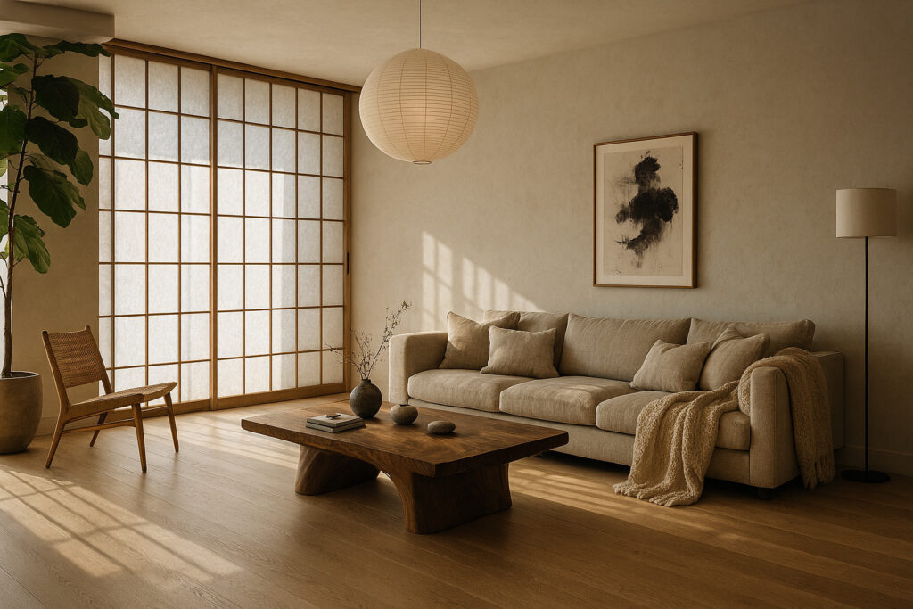 詳細プロンプト:ジャパンディ・スタイルの理想のリビング アスペクト比: 雑誌の見開きに適した横長 (3:2 または 21:9) 【全体の構図と媒体イメージ】 ハイエンドな建築・インテリアデザイン雑誌の見開きページに掲載される、広角レンズで撮影されたパノラマ写真。完璧な構図で、静謐(せいひつ)で洗練された、息をのむような美しい空間が広がっている。 【光と雰囲気】 午前中の柔らかな自然光が、部屋の片側にある大きな窓からたっぷりと注ぎ込んでいる。光は障子のような間仕切りを通して拡散され、部屋全体を温かく穏やかなグラデーションで包み込み、床や家具に長い影を落としている。空気感は静かで、穏やかで、瞑想的。 【建築的要素と素材】 天井が高く、開放的なリビングルーム。床は幅広のマットなオーク材フローリングで、美しい木目が見える。壁は漆喰(しっくい)のような質感のあるオフホワイト。 特徴的な要素として、天井から床までの高さがある、カスタムメイドの大きな「障子スクリーン風スライドドア」が設置されている。和紙ではなく、半透明のテクスチャ付きガラスと細い木枠で作られており、モダンな和の要素を表現している。 【家具と配置】 中心: 低く構えたモジュール式の大きなソファ。張り地は質感のあるベージュの厚手リネン素材。その上には、同系色の様々なテクスチャ(ウール、麻)のクッションと、チャンキーニットのブランケットが無造作に置かれている。 テーブル: ソファの前には、有機的な形をした低い無垢材(ウォールナット)のコーヒーテーブル。表面には手彫りのような質感がある。 ラウンジチェア: 窓辺には、ハンス・J・ウェグナーのスタイルを思わせる、木とペーパーコードで作られた彫刻的なラウンジチェアが一脚置かれている。 【装飾とディテール】 植物: 部屋の隅には、天井に届くほどの巨大なフィカス・ウンベラータ(観葉植物)が、素焼きの大きな鉢に植えられている。 アート&小物: 壁には抽象的な墨絵のアートが飾られている。コーヒーテーブルの上には、作家物の陶器の器、数冊のアートブック、石ころのようなオブジェがミニマルに配置されている。 照明: 天井には和紙のペンダントライト、フロアにはミニマルなスタンドライトがあり、自然光を補完している。 【写真の質感】 超高解像度の写真。布の織り目、木の導管、壁の凹凸など、すべての素材の質感が手に取るようにリアルに描写されている。被写界深度は深く、手前から奥までピントが合っている。