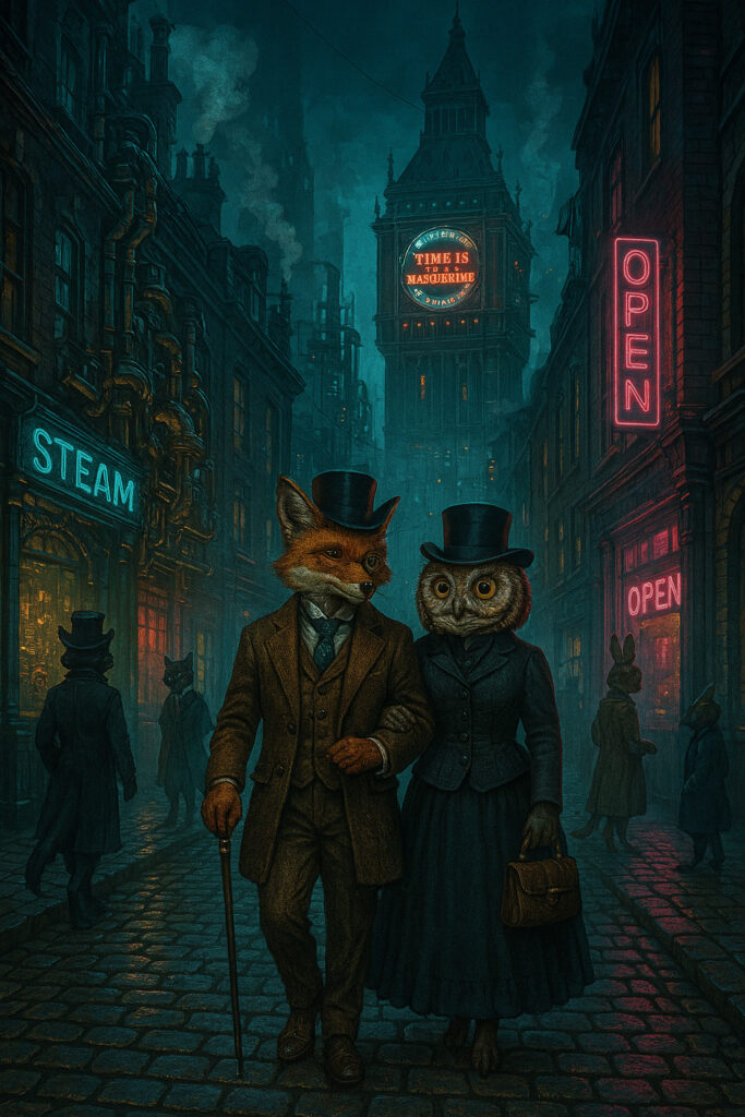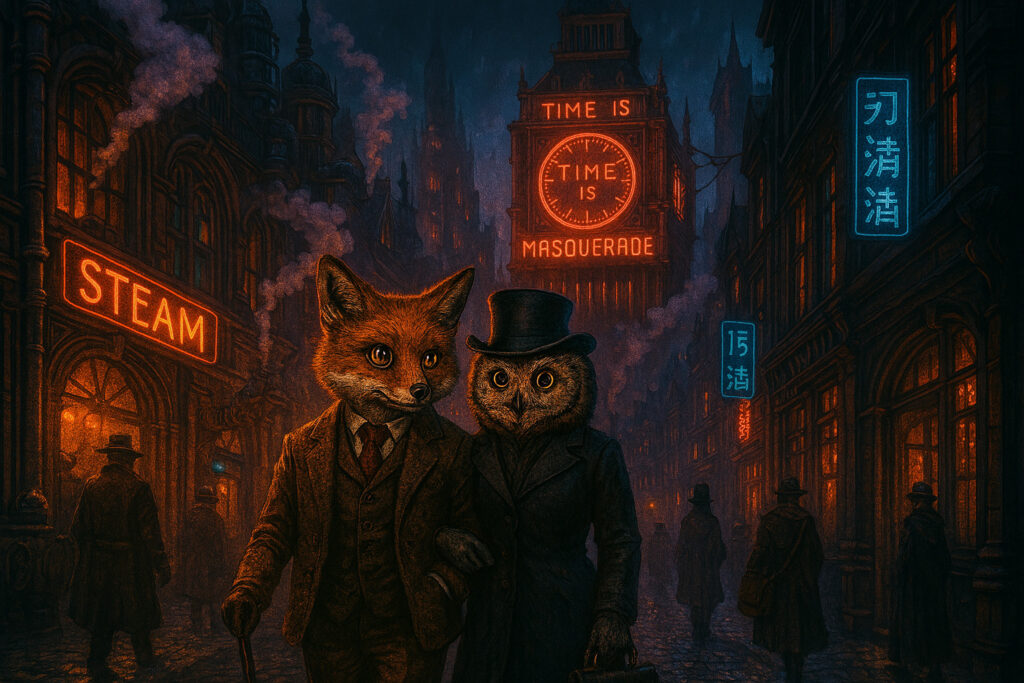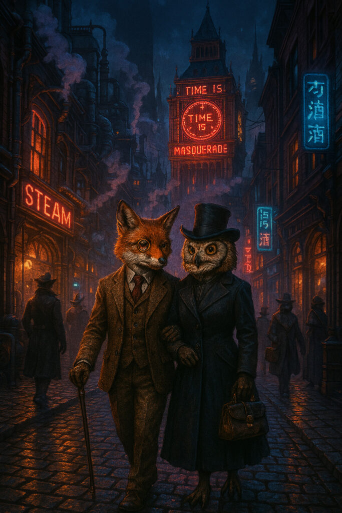 次の画像を作成してください ヴィクトリア朝時代のロンドンを模した、蒸気機関とネオンが混在するサイバーパンクな街並み。石畳の通りには、擬人化された動物たちだけが歩いており、人間は一人もいない。画面中央には、ツイードのスーツを着て片眼鏡をかけたキツネの紳士が、シルクハットをかぶったフクロウの淑女と腕を組んで歩いている。キツネは真鍮製の杖を持ち、フクロウは小さな革のハンドバッグを持っている。背景には時計塔があり、その文字盤はデジタル表示で「TIME IS MASQUERADE」と赤く光っている。