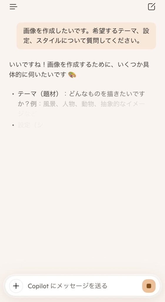 上記のような流れで、アプリ版でのCopilotでも画像生成が可能です。