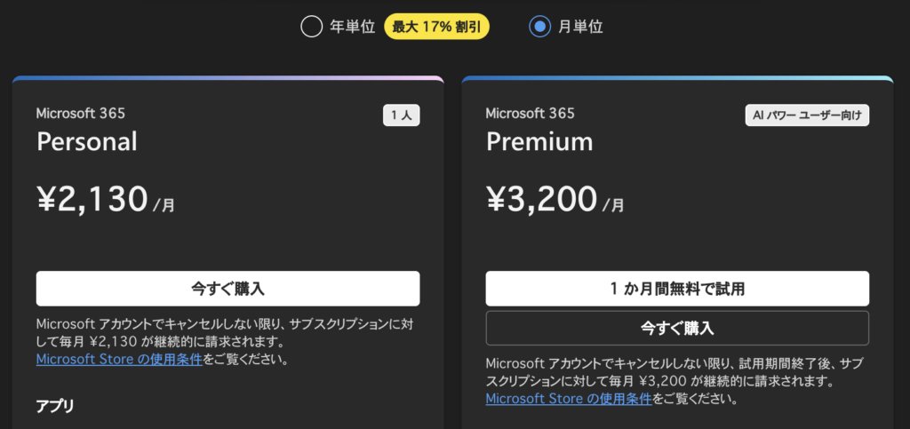 Copilot PremiumとCopilot Personalの大きな違いのひとつが月毎にかかる金額です。