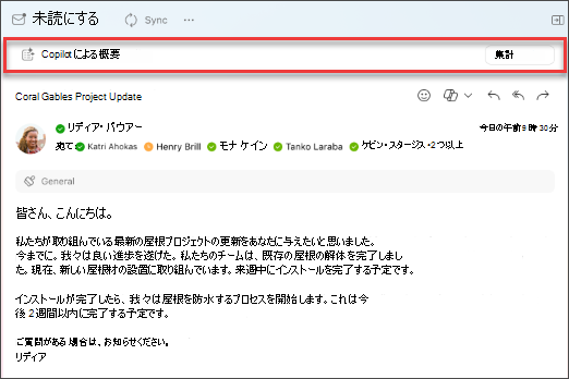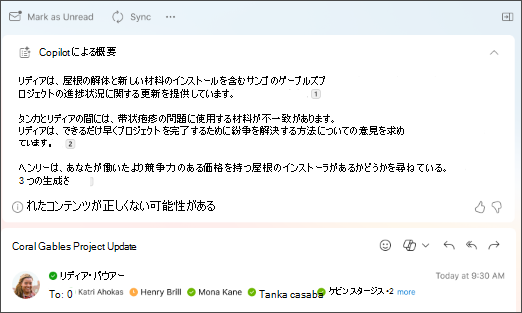 Copilot PremiumとOutlookの連携により、Copilotで受信した長文のスレッド全体を瞬時に要約し、対応すべきポイントや次のアクションを抽出することができます。