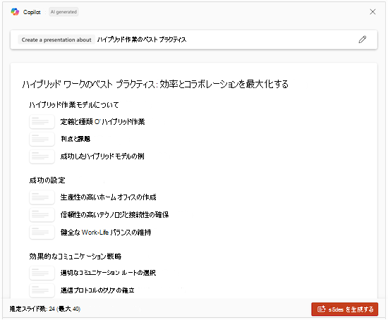長文の議事録などの既存文書や、任意のプロンプトをCopilotに共有するだけで、その内容を読み込み、デザインと構成を整えたPowerPointのスライド群を自動で一括生成できます。
