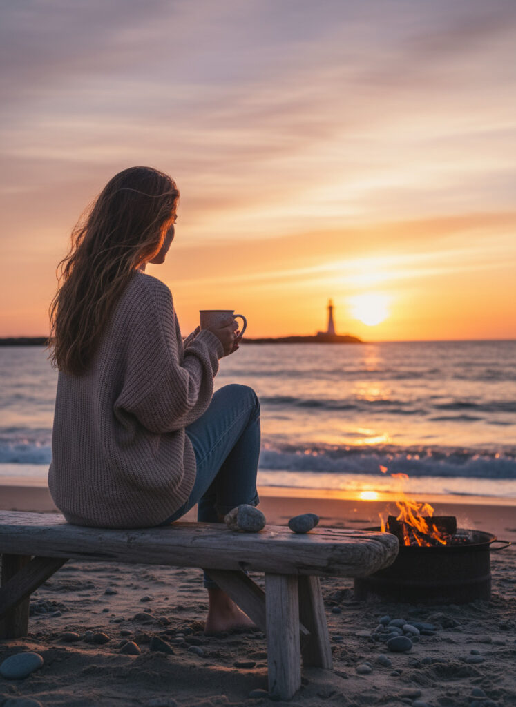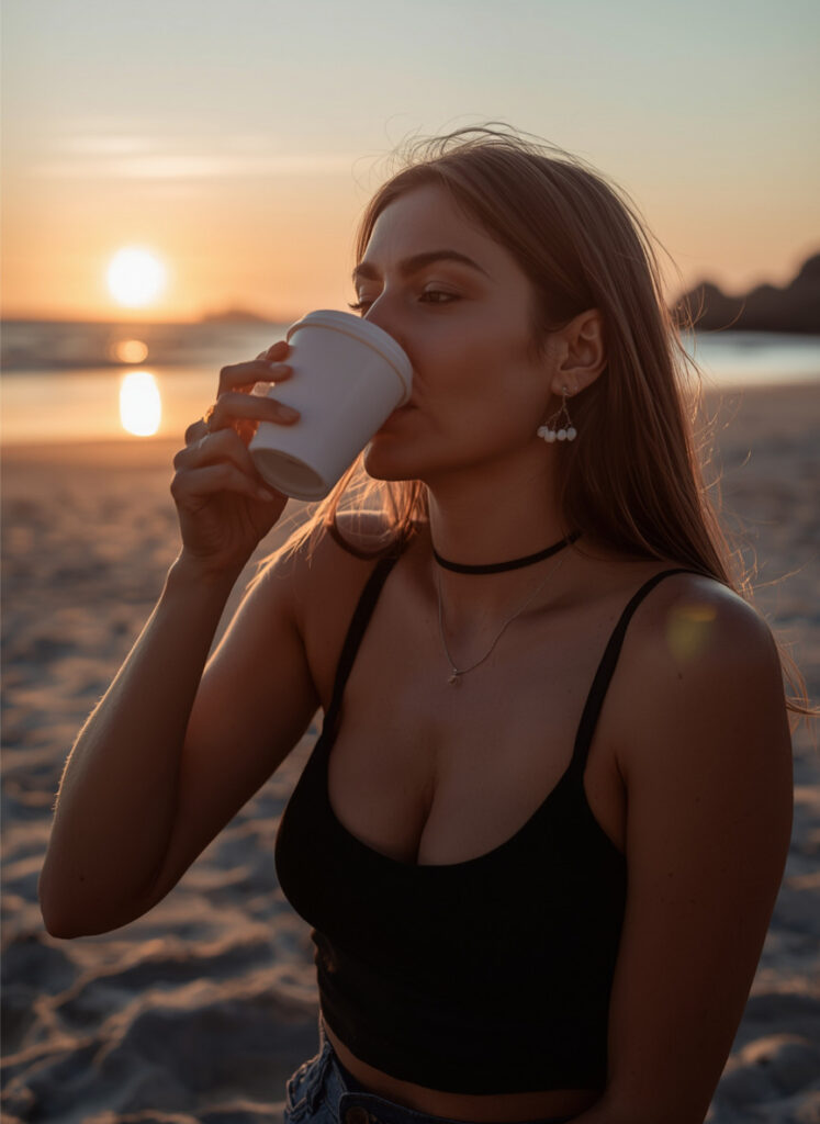 最初に、例として実際に画像を生成してみました。下記は同じプロンプト「夕暮れの海辺でコーヒーを飲む女性」で生成した結果です。